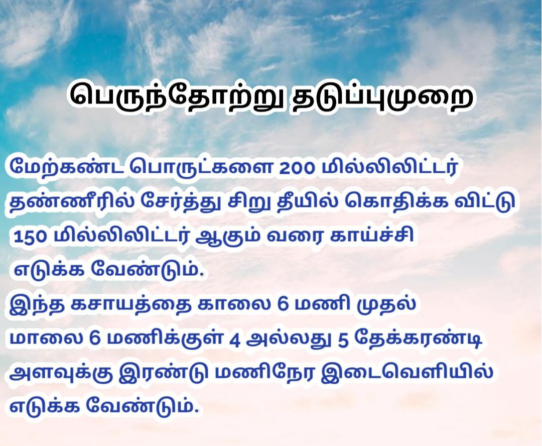 ** மேற்கண்ட அறிகுறிகளுடன் நுரையீரல் தொற்று, சளி, இருமல், மூச்சு வாங்குதல் போன்ற அறிகுறிகள் இருப்பின் மருந்து 1 உடன் சேர்த்து மருந்து 2 ஐயும் எடுத்துக் கொள்ளவும்.